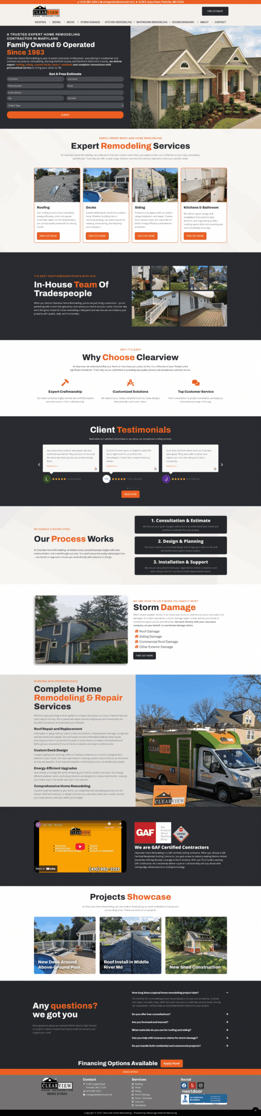 This website serves as the primary digital presence for the company, showcasing their services, expertise, and reputation in the home remodeling industry. The site also aims to drive leads, facilitate customer inquiries, and establish Clearview as a trusted, professional provider of remodeling services in the local area.